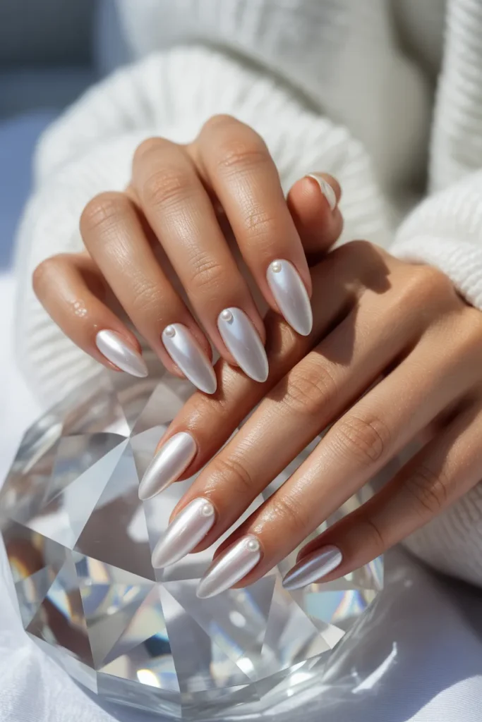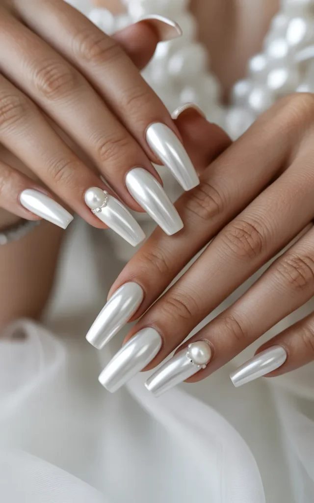 Snow Pearl Shimmer Nails create a glowing bridal moment that looks as if your hands are dusted in soft snow. The reflective pearl finish and minimal pearl accents exude luxury without overdesign.