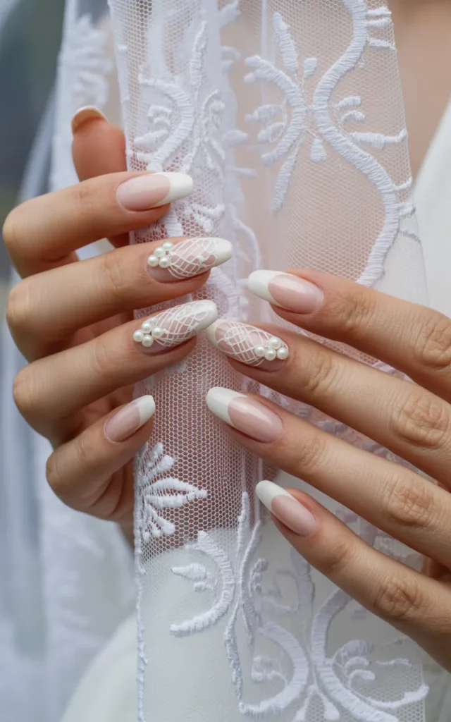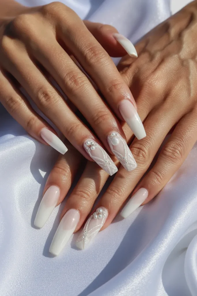 The full white hand look enhances the nails beautifully, giving your hands a radiant bridal glow. Every pearl and lace swirl captures the romantic charm of your special day, perfect for wedding photos and close-up ring shots.