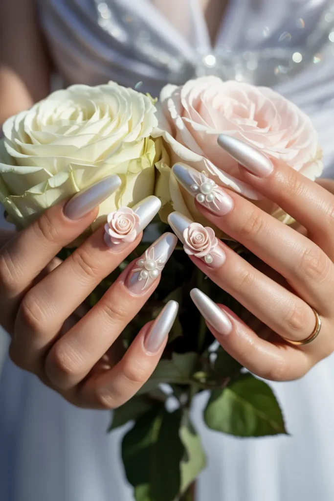 White Rose Pearl Nails capture the beauty of blooming romance. The 3D roses combined with pearls create a soft sculpted elegance that makes every bride’s hand look graceful and divine.