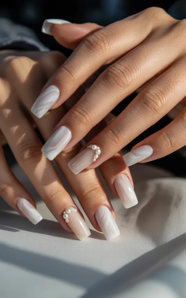 White Marble Pearl Nails bring modern luxury to bridal style. The smooth marble design, paired with tiny pearls, creates a chic and artistic appearance.