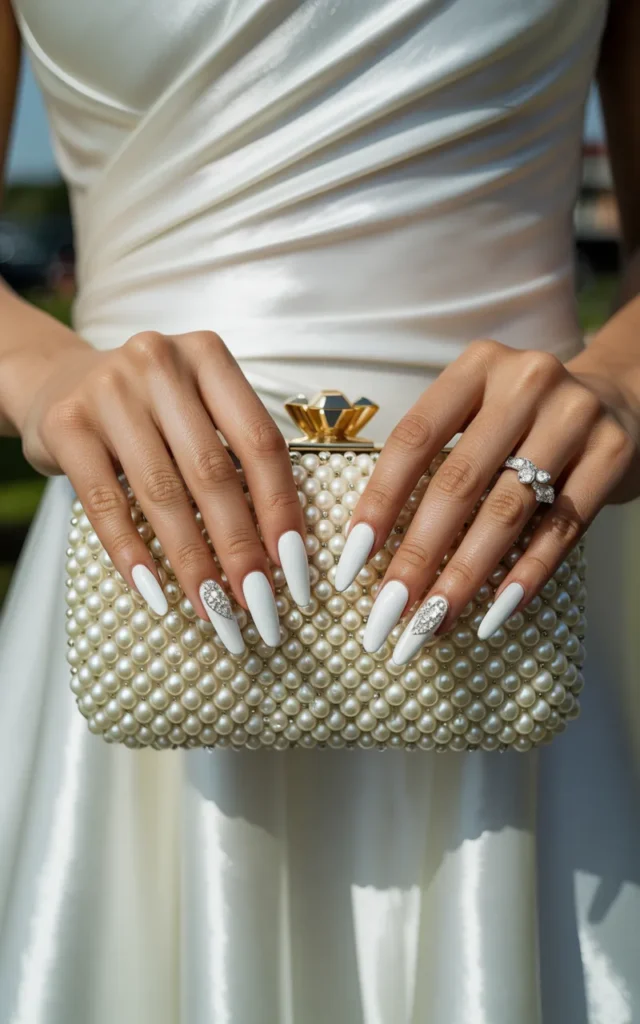 These pure white pearl lace nails define bridal luxury. The soft milky base and intricate lace designs give a couture-level finish that mirrors a wedding gown’s detail. Under soft daylight, the pearls glisten delicately, creating an angelic effect.