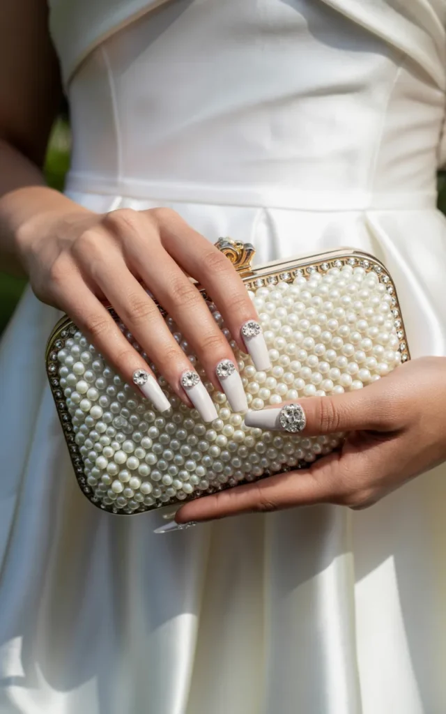 With glowing white hands and subtle shimmer, every photo looks like it belongs in a luxury bridal catalog. These nails match diamond jewelry perfectly, adding grace and elegance to every movement of your hand.