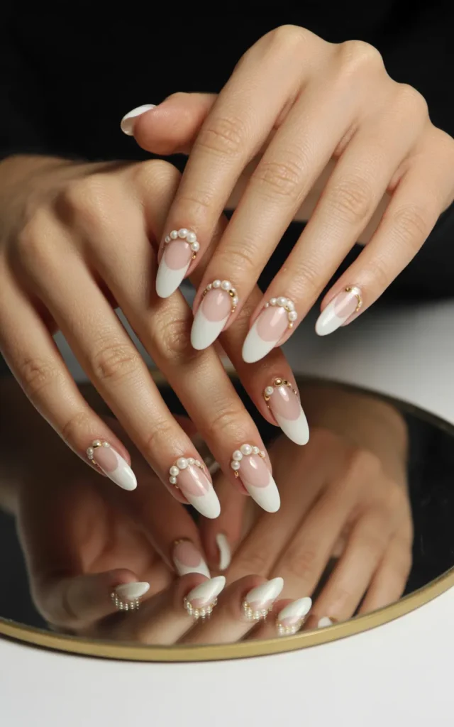 Gold Touch Pearl Tips merge timeless beauty with royal glamour. The soft gold details elevate a classic bridal manicure into something extraordinary.