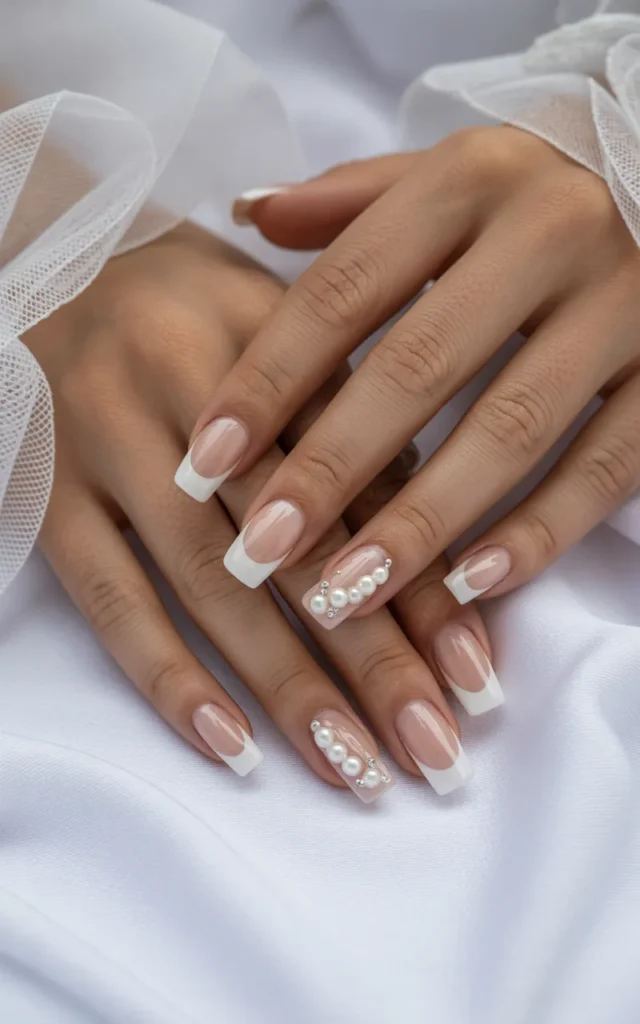 The bright white lighting enhances your skin tone, making the pearls shine even more. These nails are ideal for brides who love soft glow, understated elegance, and a look that feels expensive yet effortlessly graceful.