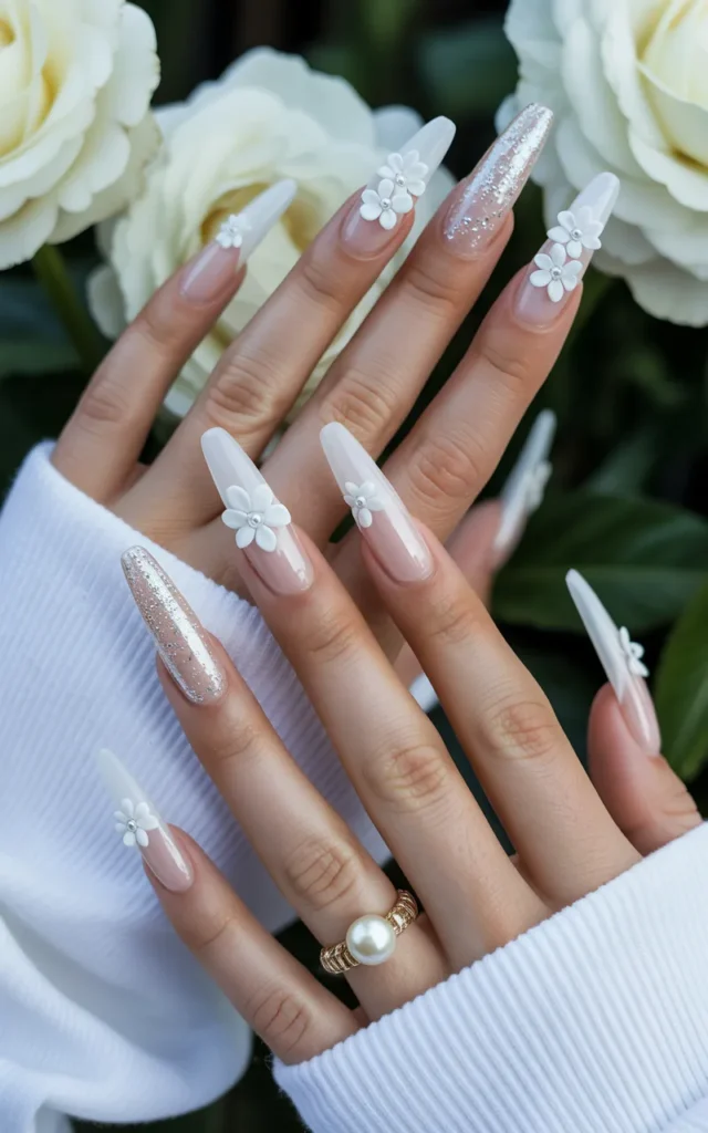 The glowing white hands and sparkling details capture the essence of bridal beauty. These nails stand out in every photo — graceful, floral, and perfectly balanced between elegance and creativity.