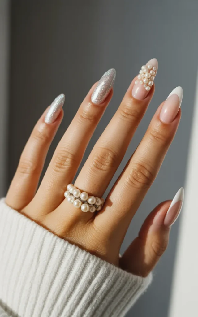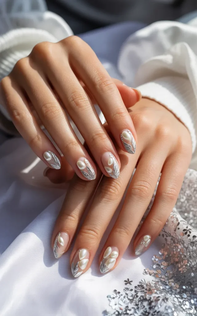 Silver Bloom Pearl Nails are perfect for brides who love artistry and shine. The silver leaves and pearl petals look like miniature bridal bouquets frozen in light.