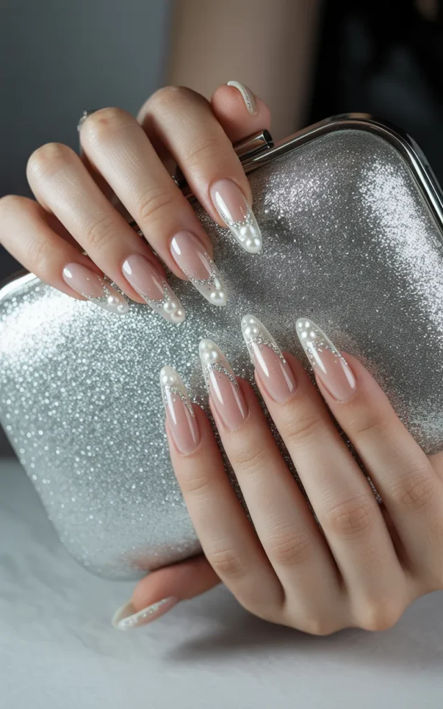 The Silver Pearl Glitter Fade design adds sparkle to your bridal look without overpowering it. The silver shimmer fades delicately from tip to base, blending with soft pearl highlights.
