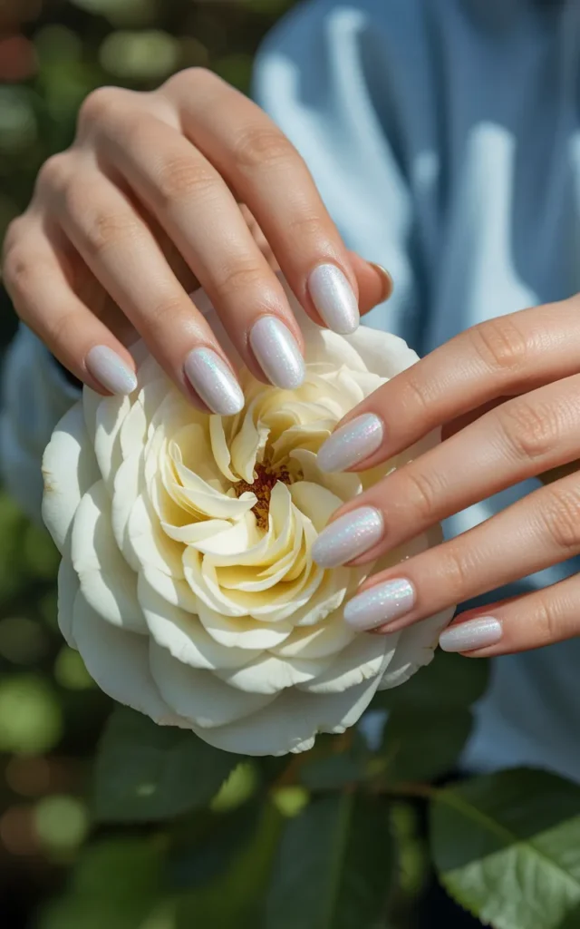 Frosted Pearl Aurora Nails reflect the magic of winter mornings. The frosty texture combined with subtle holographic shimmer creates an otherworldly bridal glow.