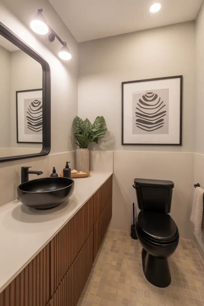 Black accents introduce striking contrast and modern sophistication to a half bathroom. Matte black faucets, mirrors, or hardware ground the space visually and create a sharp, contemporary look that feels confident and clean.