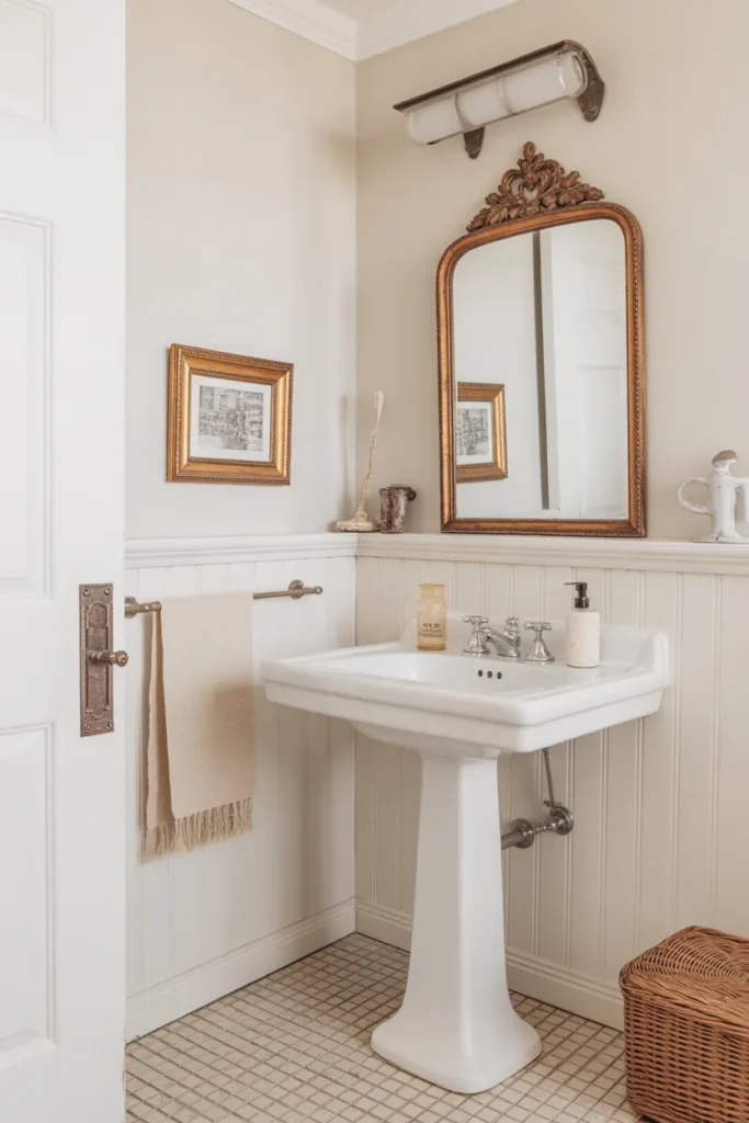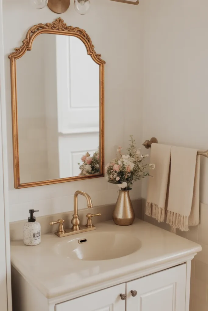 Gold hardware adds instant warmth and sophistication to a half bathroom. Faucets, towel rings, and mirror frames in gold or brass finishes bring subtle glamour without overwhelming the space. Small details make a noticeable impact in compact rooms.