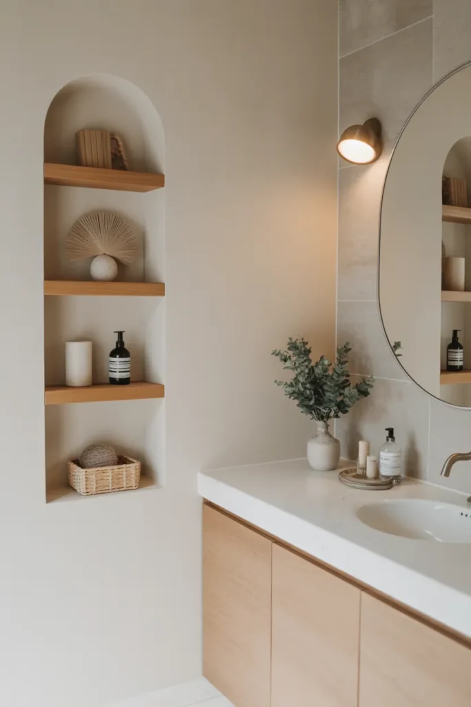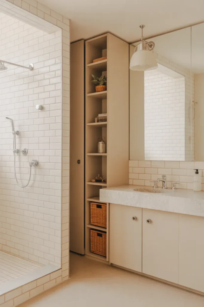 This approach keeps the bathroom functional without sacrificing style. Thoughtfully styled vertical storage allows for both organization and decoration, ensuring the space remains practical, visually balanced, and uncluttered.