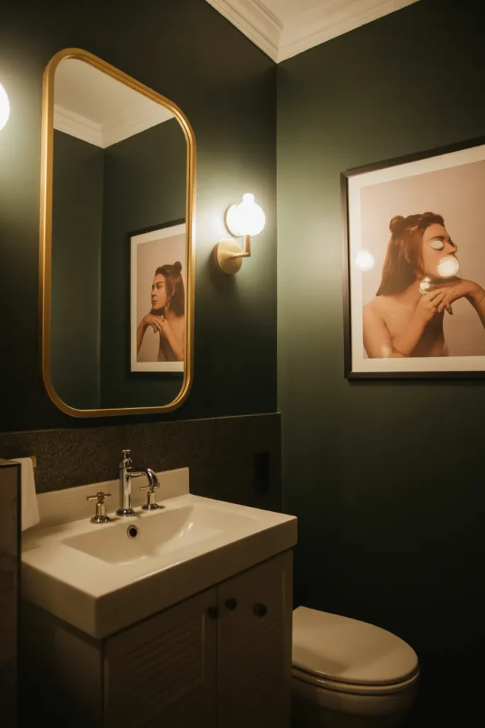 Dark paint can create a bold yet elegant atmosphere in a half bathroom. Shades like charcoal, deep navy, or forest green add depth and sophistication, making the space feel intimate and luxurious. In small rooms, these colors feel deliberate rather than overpowering.