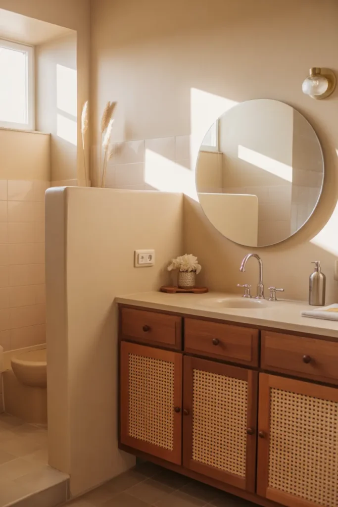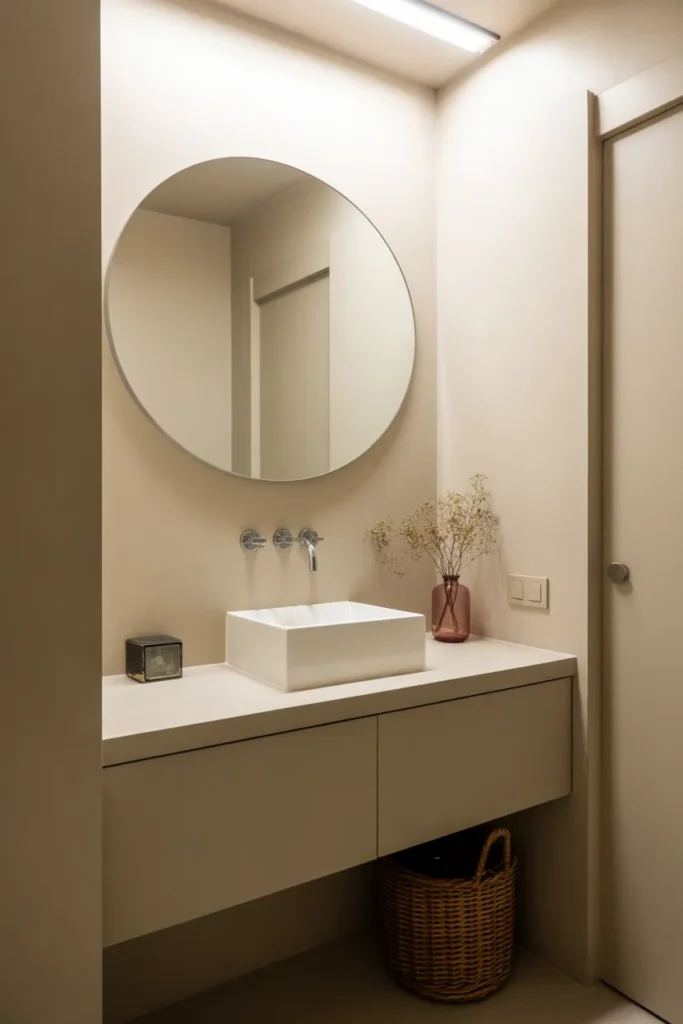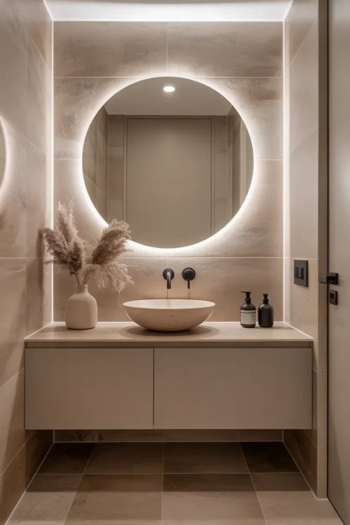 Whether round, arched, or rectangular, an oversized mirror enhances proportion and balance. Paired with simple lighting and fixtures, it transforms a compact bathroom into a space that feels polished, inviting, and surprisingly spacious.