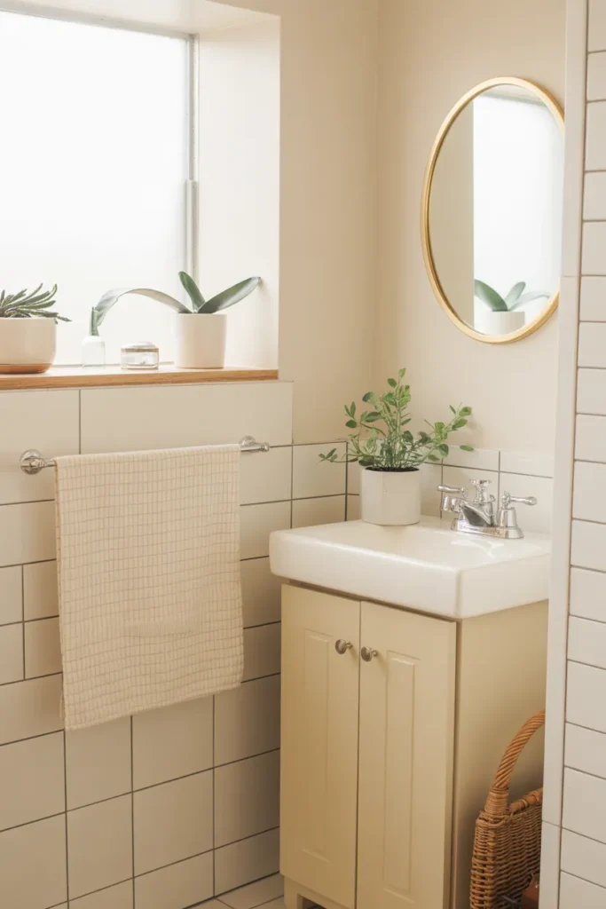 Adding small plants instantly refreshes a half bathroom. Even a single potted plant brings life, softness, and a natural element into the space. Greenery contrasts beautifully with hard surfaces like tile and stone.