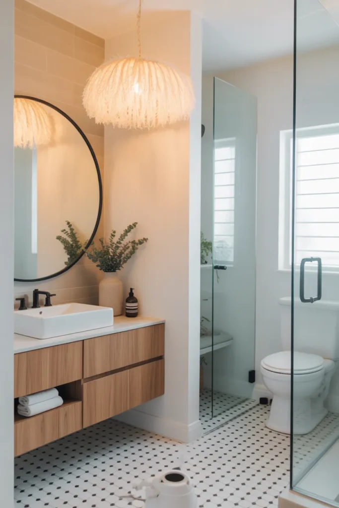 Lighting that doubles as décor enhances both function and style. A bold fixture creates a focal point that elevates the entire room, giving the bathroom a refined, designer-quality finish.