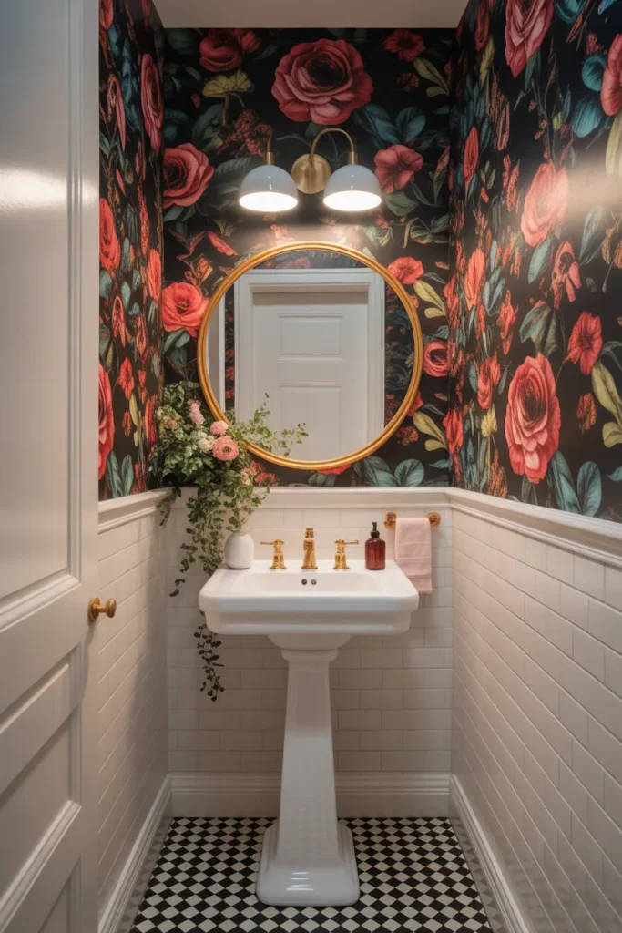A half bathroom is the ideal place to embrace bold design choices, and statement wallpaper instantly transforms the space. Dramatic florals, modern geometrics, or artistic patterns add personality and depth, turning a small room into a memorable design feature. Because the space is compact, bold wallpaper feels intentional rather than overwhelming.