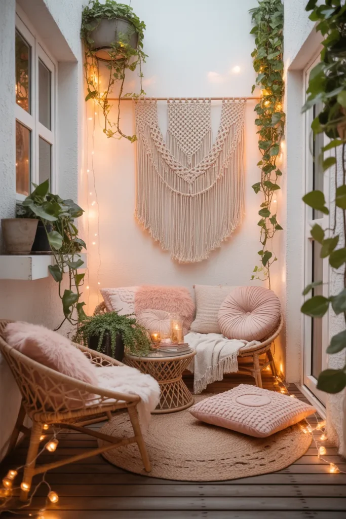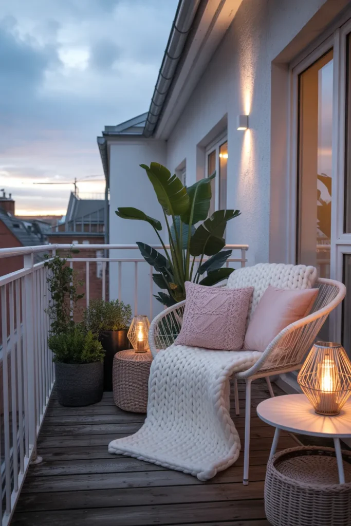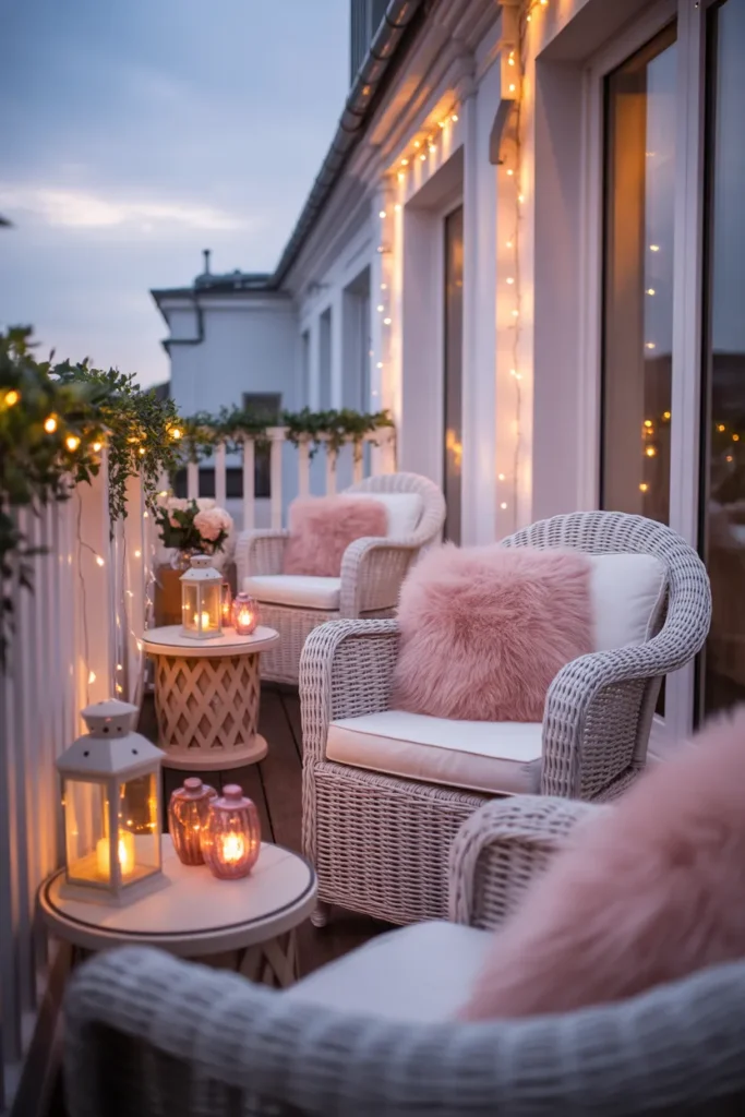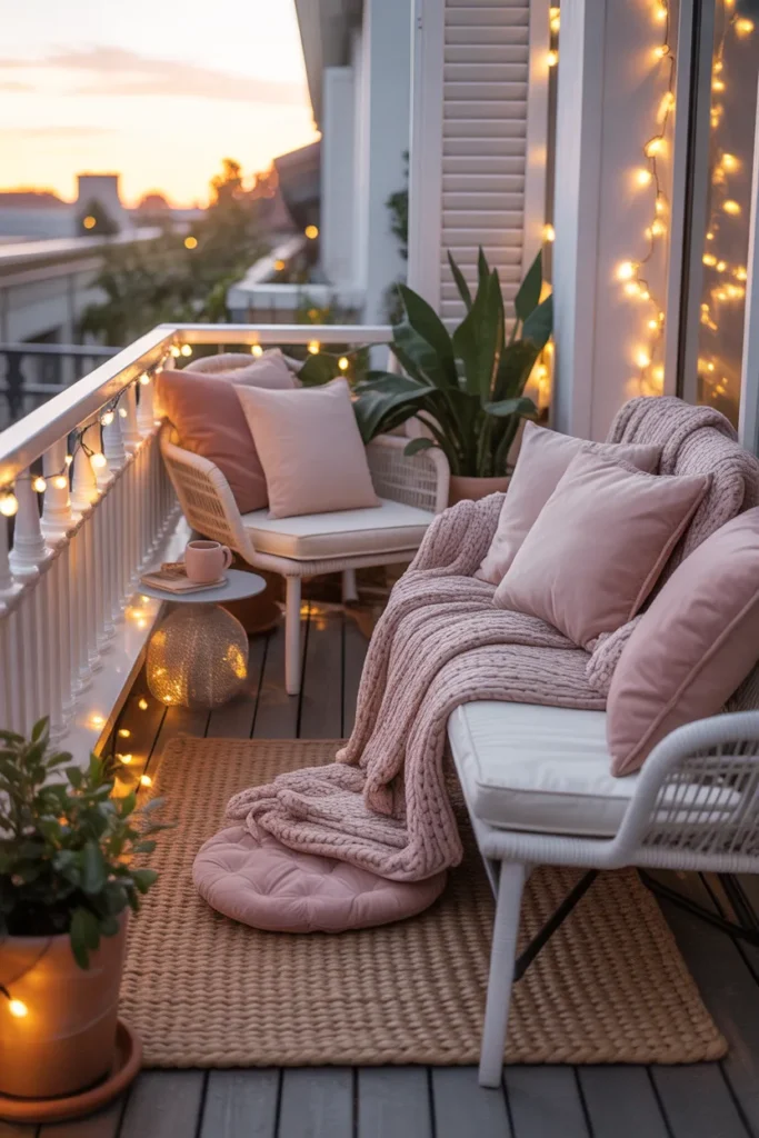 String lanterns add warmth and charm to a pastel balcony. Their soft glow creates a calm evening atmosphere that feels intimate and inviting. Paired with blush cushions and light furniture, the space feels cozy without becoming heavy or dark.