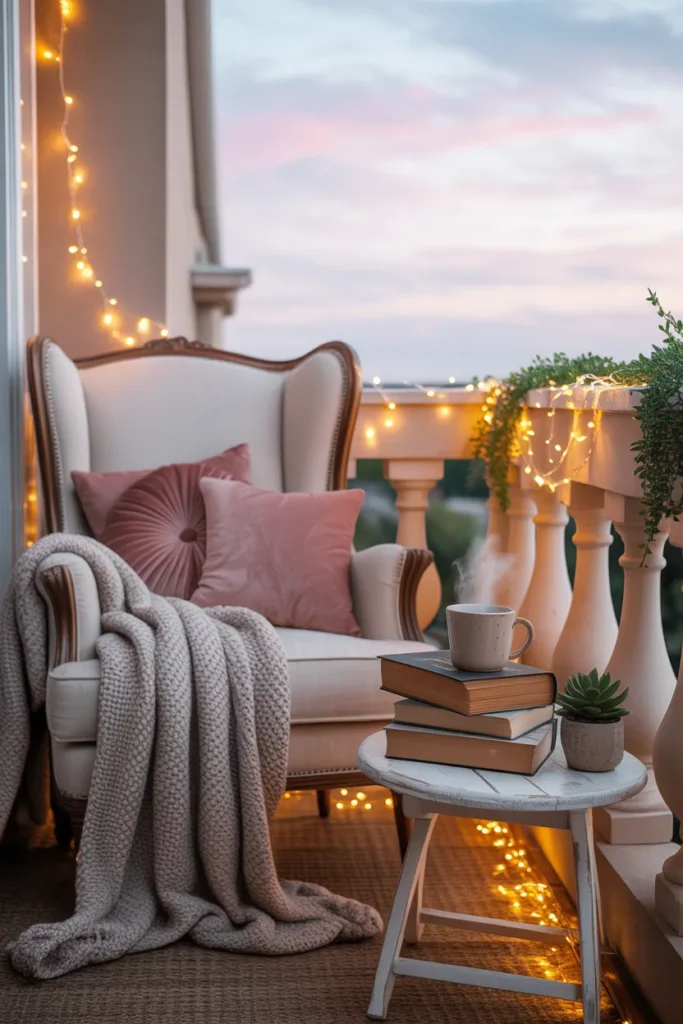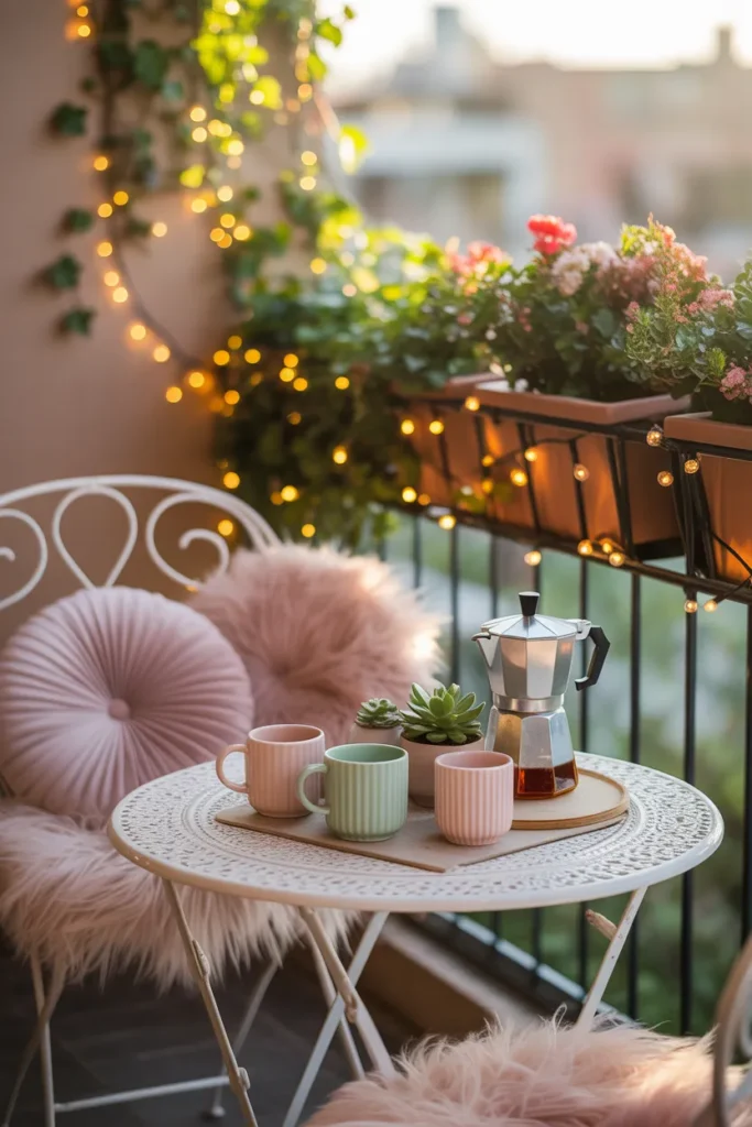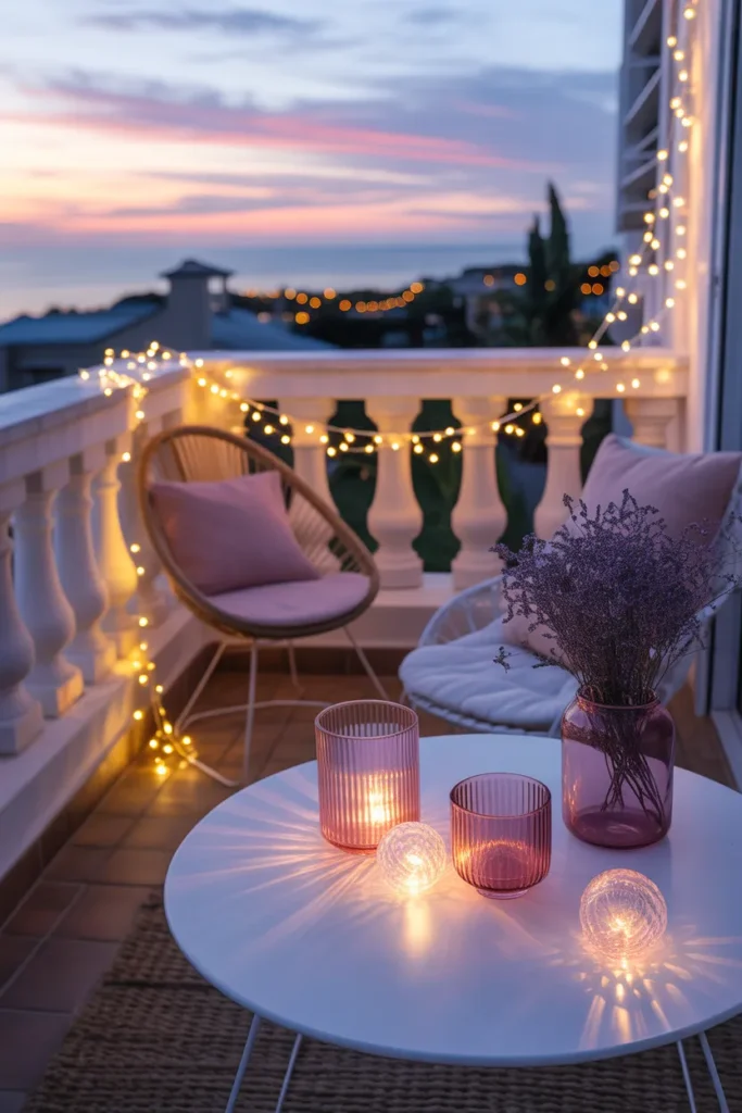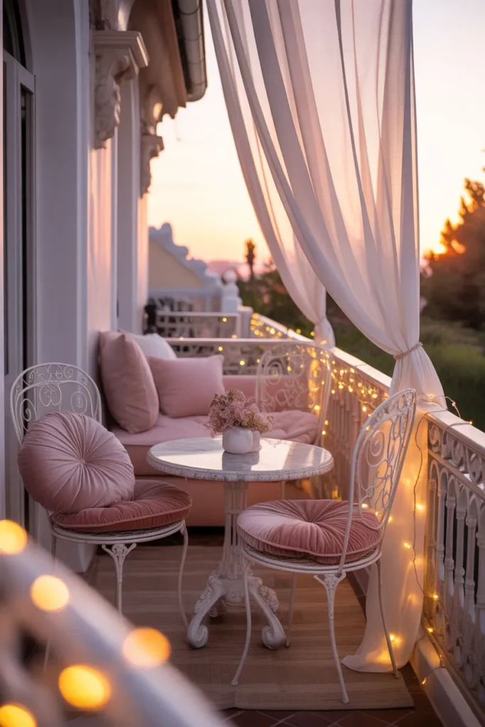 1. Romantic Pastel Balcony with Fairy Lights
