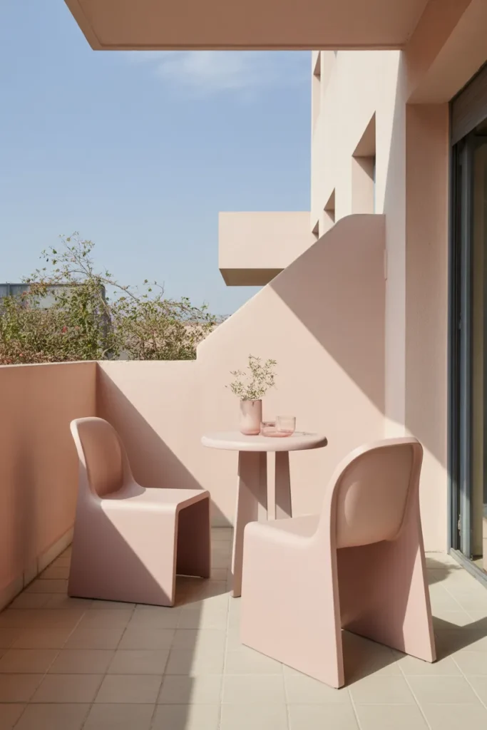 A minimal pastel balcony with sculptural seating feels modern, clean, and thoughtfully designed. Curved chairs in soft pink or beige add visual interest without overwhelming the space. Clean lines and a restrained color palette keep the balcony open and balanced, allowing light and form to take center stage.