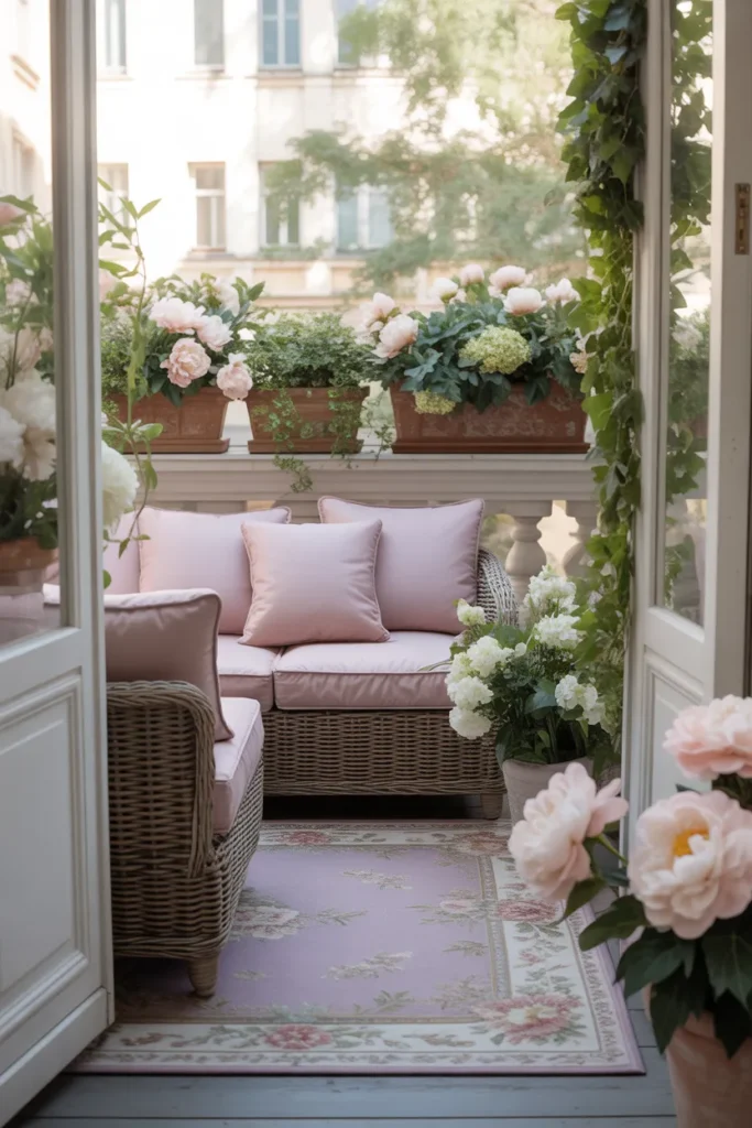 A floral rug adds personality and softness to a pastel balcony. Gentle patterns introduce visual interest while keeping the space light and elegant. Paired with blush seating and simple decor, the rug becomes a subtle focal point without overpowering the design.