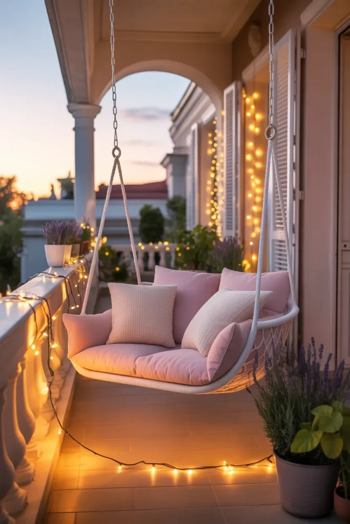 A hanging swing chair brings charm and relaxation to a pastel balcony. Soft cushions and gentle colors enhance the comforting feel, while the swing adds a sense of movement and playfulness. The design feels light yet cozy.