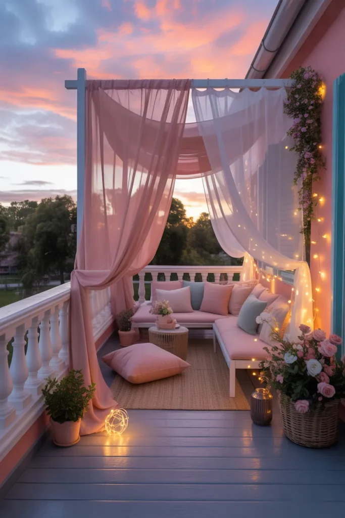 16. Pastel Balcony with Soft Canopy Curtains