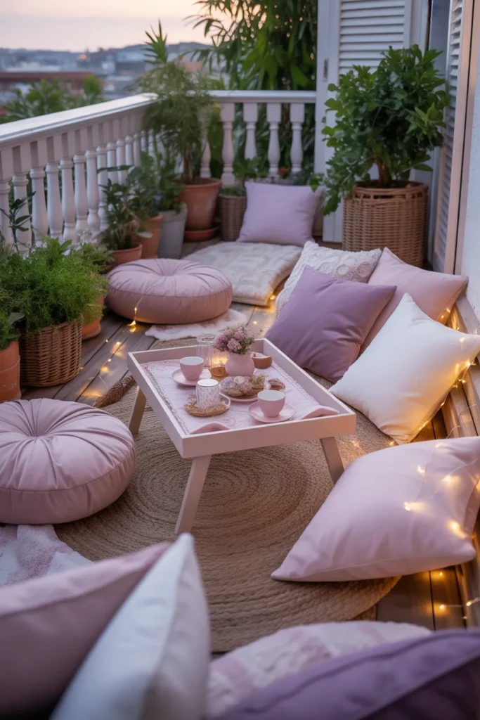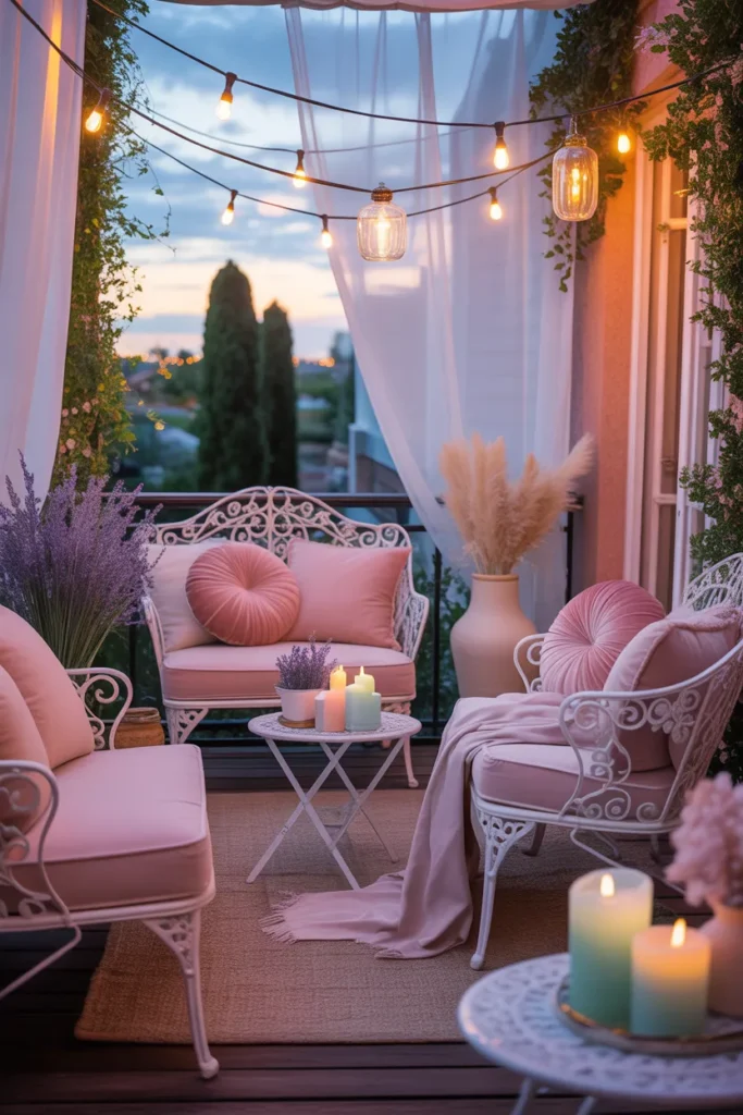 12. Cozy Pastel Balcony for Evening Relaxation