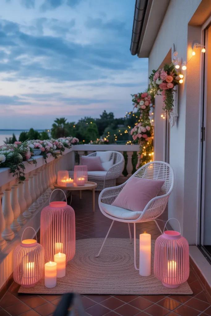 Pastel lantern lighting adds timeless romance to a balcony setting. Soft pink and white lanterns create a gentle glow that feels calm and intimate, especially during the evening. When combined with subtle floral accents and light decor, the balcony takes on a dreamy, soothing character.