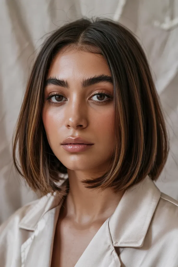 A blunt bob in a warm brown shade feels clean, modern, and incredibly sophisticated. The straight edges of the cut highlight the richness of the color, creating a strong yet soft visual impact. Warm undertones keep the look approachable and flattering.