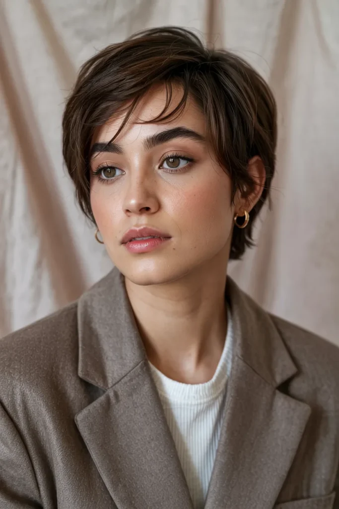 This hairstyle is perfect for those wanting a confident, low-maintenance look. Warm brown tones add depth and dimension, making the pixie cut feel stylish and flattering. It’s a chic, modern option that stands out effortlessly.