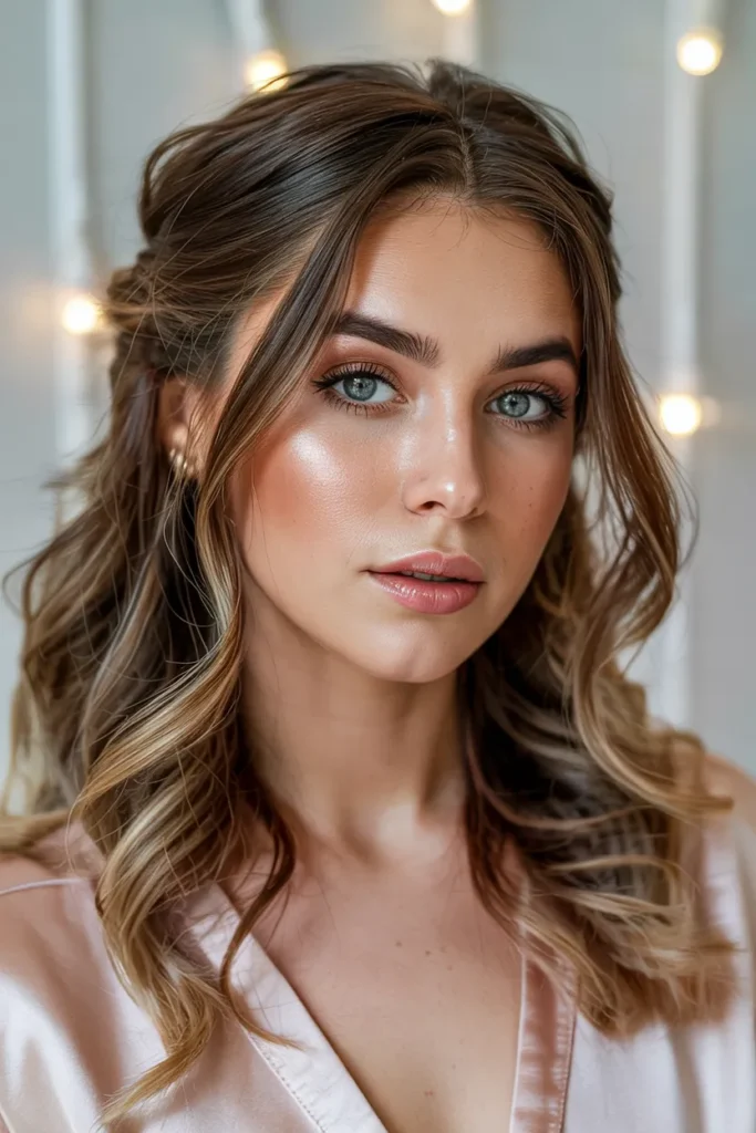 A half-up hairstyle allows warm brown tones to shine while adding structure and elegance. The lifted crown creates volume, while loose lengths keep the look relaxed and natural.