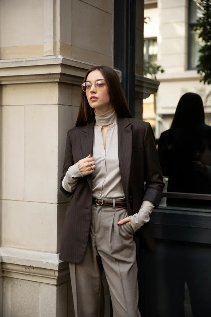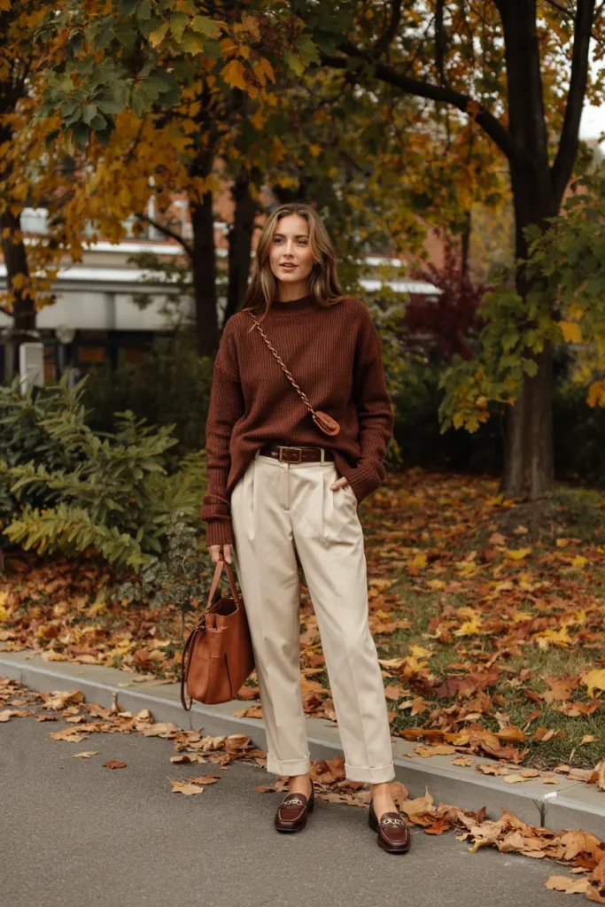 Rich brown tones are a cornerstone of old money fall fashion. A chocolate brown knit sweater paired with cream trousers feels warm, refined, and timeless. The contrast is soft rather than dramatic, creating a look that feels grounded and elegant. This outfit emphasizes texture and tailoring, two essential elements of understated luxury.