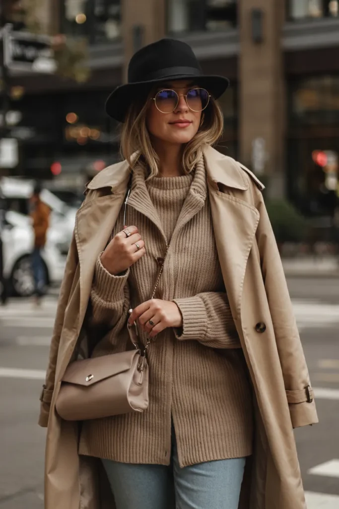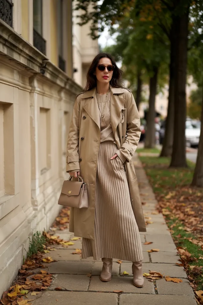 A beige trench coat paired with tailored knitwear creates an effortlessly elegant fall outfit. The clean lines and neutral tones embody timeless sophistication. This look is practical yet refined, perfect for transitional weather.