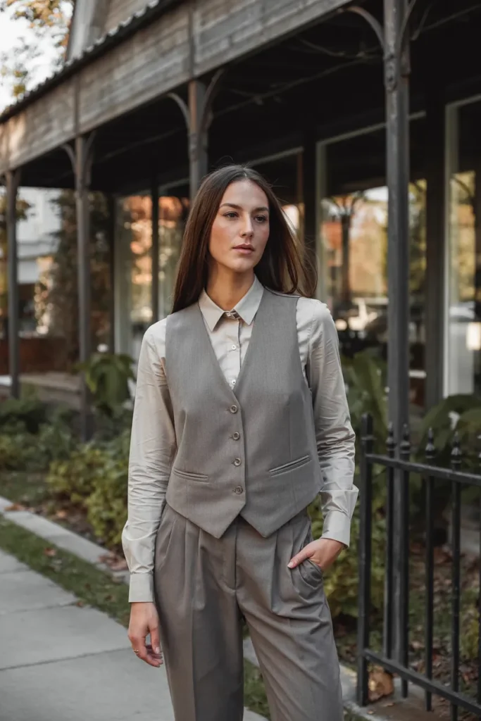 A tailored vest adds structure and heritage charm to fall outfits. Worn over a blouse and paired with slacks, it creates a refined yet modern look. This combination reflects timeless elegance through sharp tailoring and neutral tones.