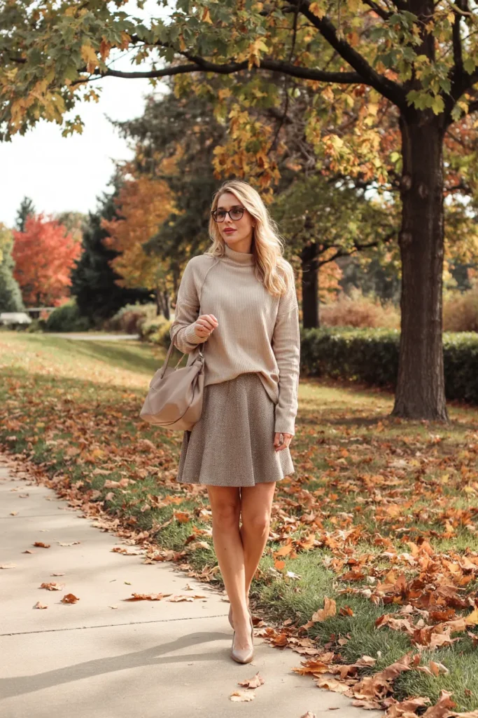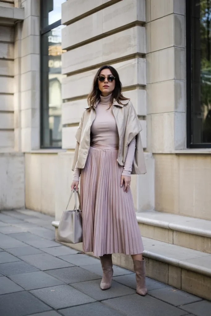 A fine knit turtleneck paired with a midi skirt creates a refined silhouette that’s perfect for fall. The look feels modest, elegant, and thoughtfully styled. Neutral shades enhance its timeless appeal.