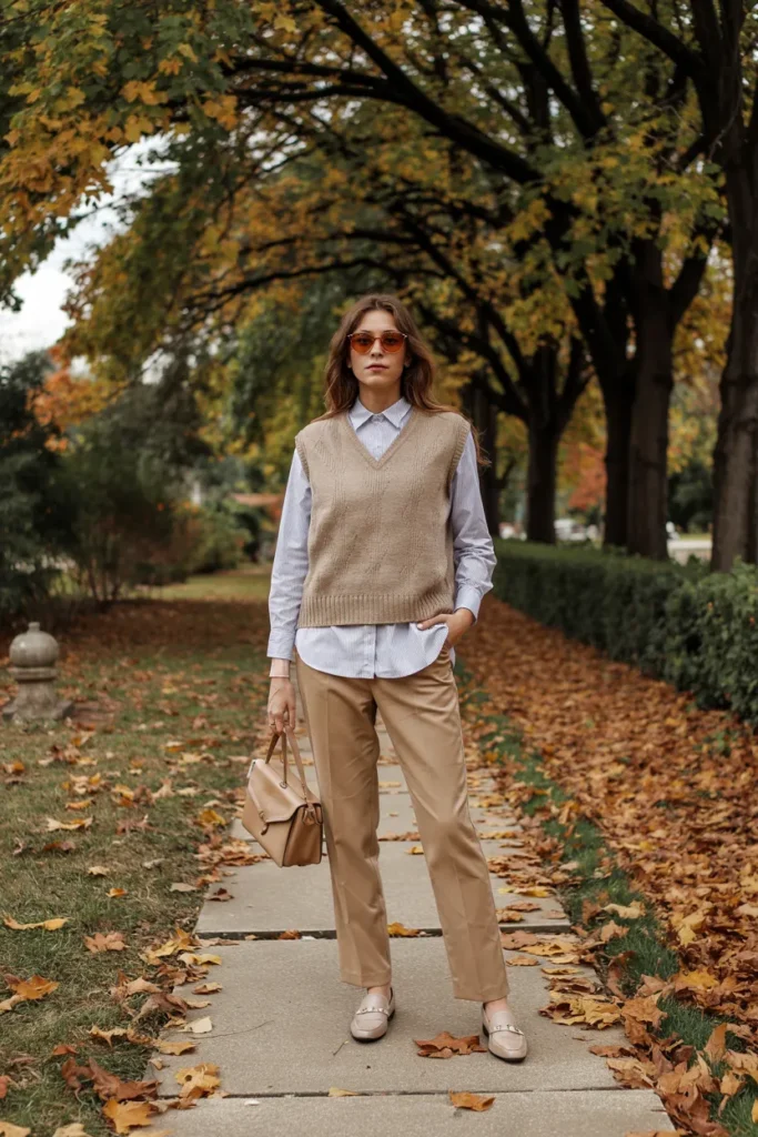Layering a wool sweater vest over a blouse adds depth without excess. This outfit feels academic, refined, and quietly luxurious. The structured layering reflects traditional style sensibilities while remaining practical for fall weather. Neutral shades keep the look cohesive and timeless.
