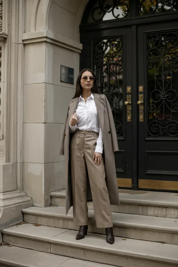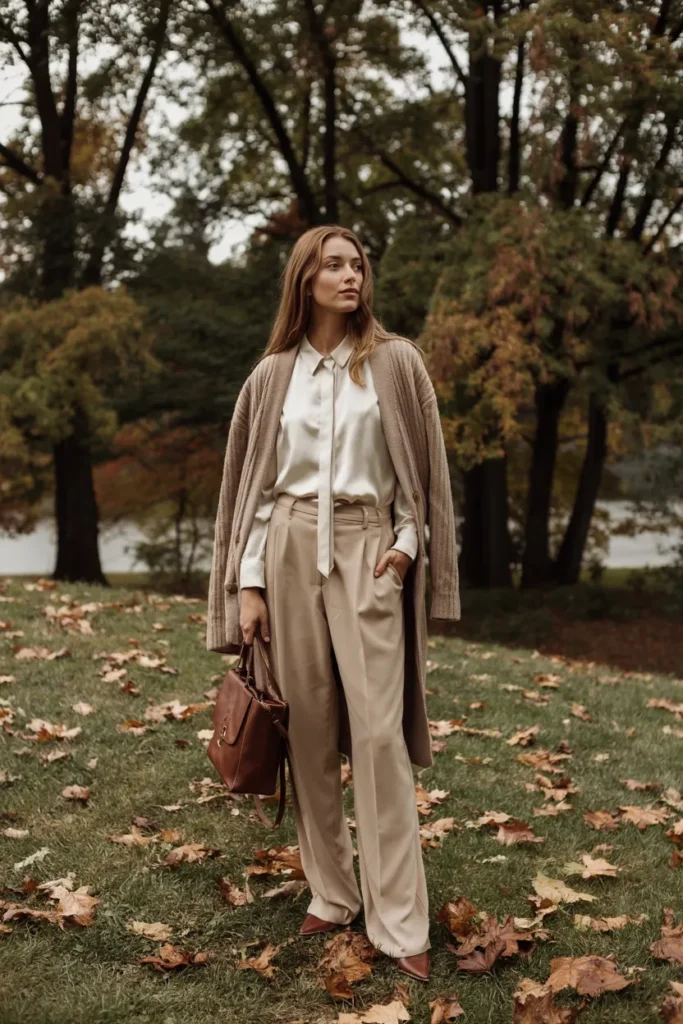 This outfit reflects understated confidence. Accessories remain minimal—leather loafers, a structured tote, and perhaps a silk scarf. The elegance lies in restraint. This is the type of outfit that looks just as appropriate at a café in Paris as it does during a crisp fall afternoon walk, embodying effortless sophistication.