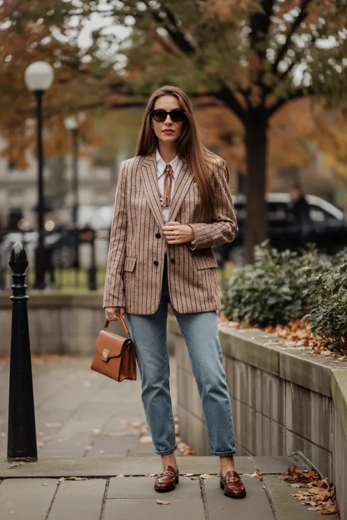 A tweed blazer is deeply rooted in heritage fashion and remains a cornerstone of old money style. When styled with straight-leg jeans, it creates a refined yet relaxed fall outfit. The structured texture of tweed instantly elevates denim, making the look feel intentional rather than casual. Earthy tones like brown, gray, or muted green keep the aesthetic classic.