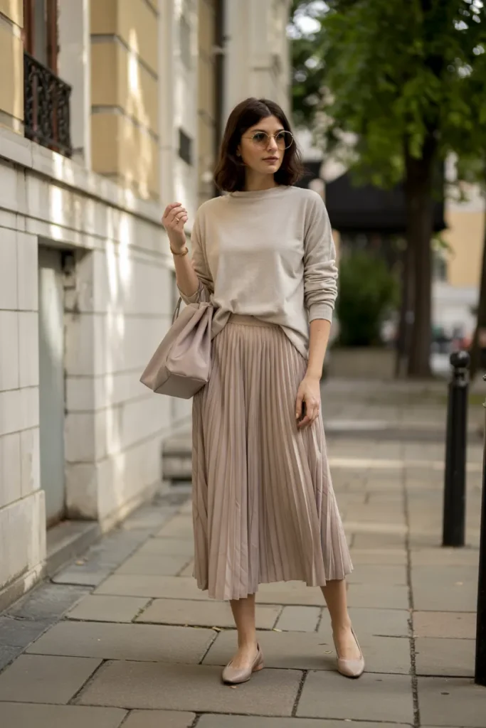 A fine cashmere sweater instantly signals timeless wealth and refined taste. When paired with a pleated midi skirt, the outfit feels feminine yet composed. The gentle movement of the skirt contrasts beautifully with the softness of the knit, creating visual balance without appearing overstyled. Neutral tones like taupe, ivory, or soft gray maintain the classic old money palette.