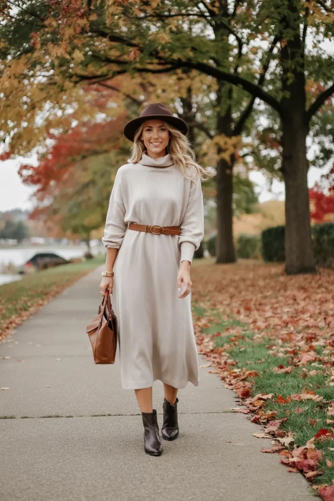 Ideal for fall outings or casual dinners, this look requires minimal styling. Classic boots, a leather handbag, and subtle jewelry complete the ensemble. The result is timeless, practical, and effortlessly chic—perfect for embracing refined fall fashion.