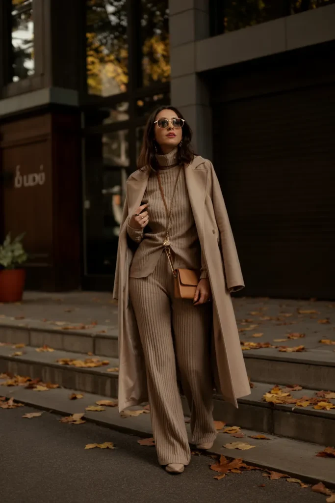 A matching knit set layered under a long coat creates a streamlined and sophisticated fall outfit. The monochromatic look elongates the silhouette, while the coat adds structure and polish. This combination feels modern yet rooted in tradition, making it a favorite among timeless wardrobes.