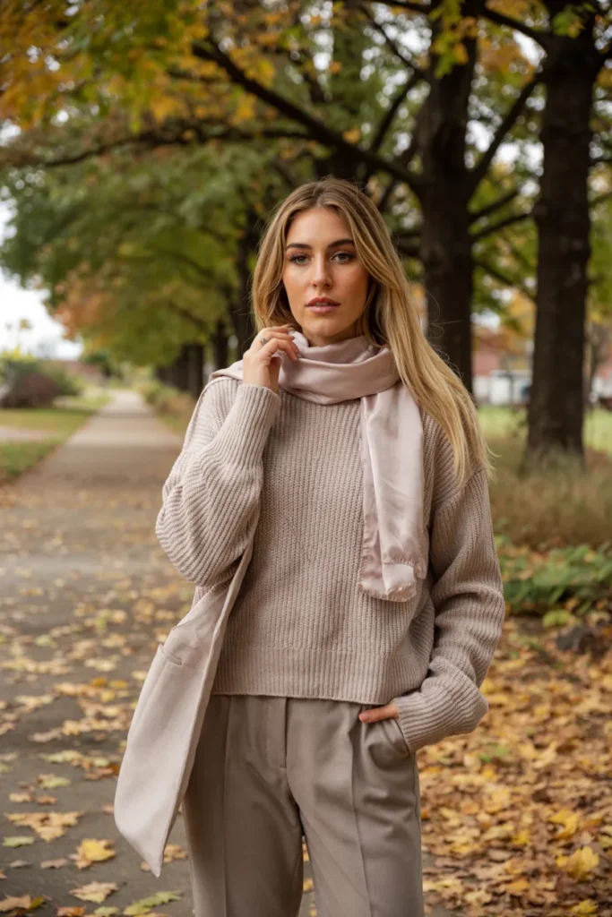 A soft gray knit paired with a matching scarf creates a cohesive and elegant fall look. The tonal styling feels calm and intentional, highlighting the beauty of simplicity. This outfit emphasizes comfort without sacrificing refinement.