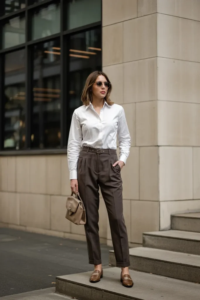 A crisp button-down shirt is a non-negotiable staple in old money fashion. Paired with tailored slacks, it creates a look that is clean, confident, and endlessly versatile. This outfit relies on impeccable tailoring and high-quality fabric rather than embellishments, making it suitable for countless fall occasions.