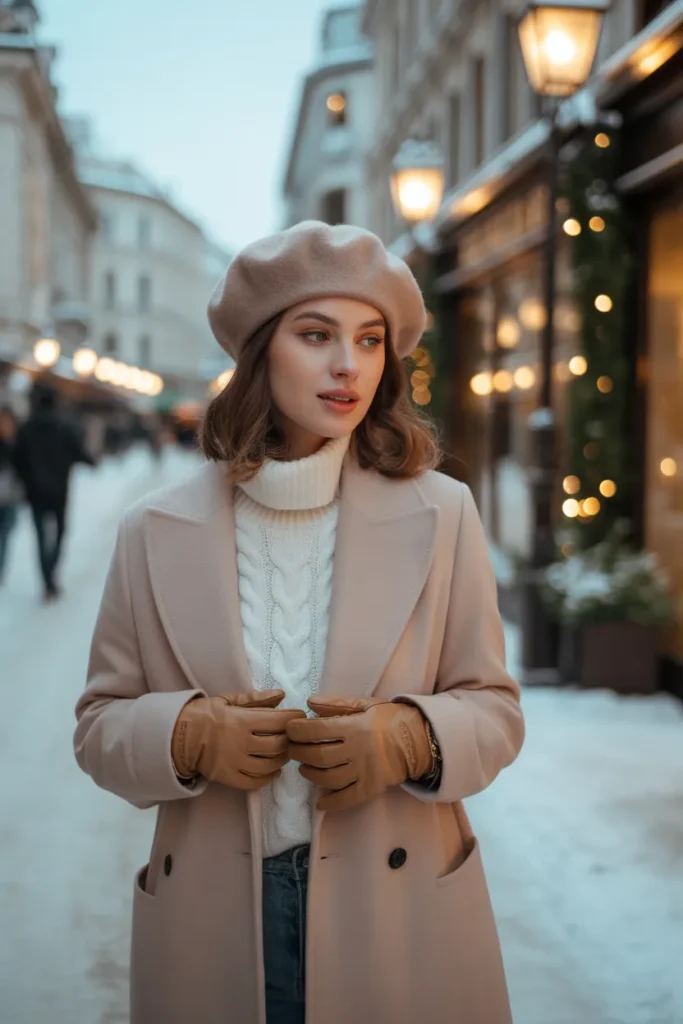 A cream coat paired with a beret creates a soft winter look that feels effortless and feminine. The cable-knit sweater adds warmth and depth, helping the outfit stay cozy even in colder climates. Sam likes this combination for travel photos because the soft neutrals blend beautifully with historic winter streets and warm lantern light. The suede gloves give the outfit a polished final touch.