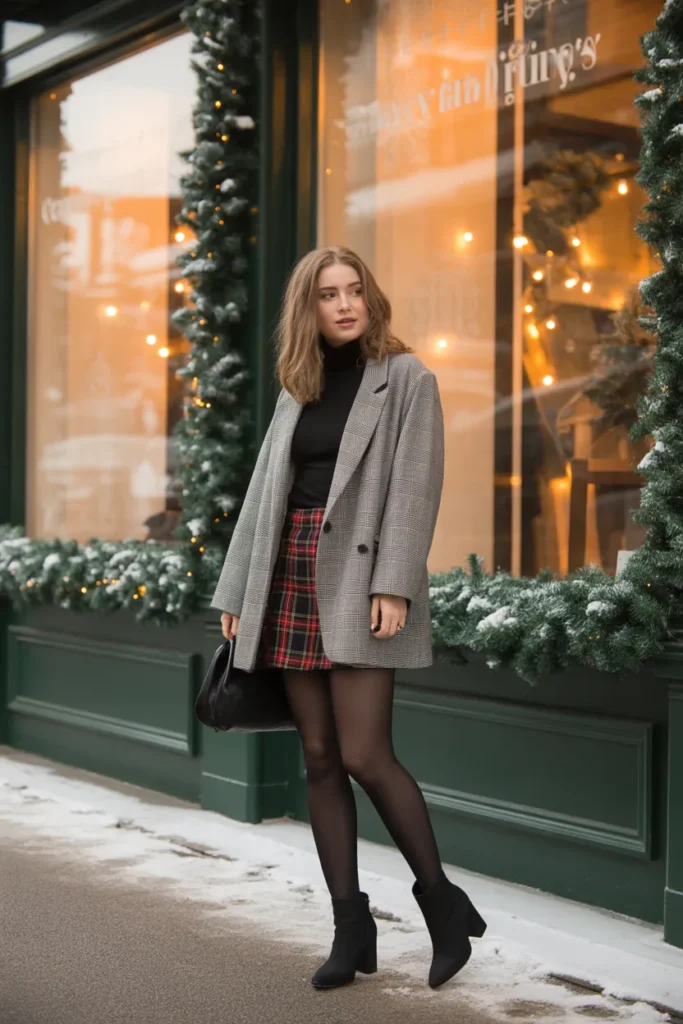An oversized blazer brings smart structure to winter outfits while keeping things comfortable. Pairing it with a turtleneck and mini skirt creates a fun mix of classic and modern. Sam adds tights for warmth, making the outfit practical even in colder weather. The plaid skirt gives a subtle festive touch that matches winter décor and holiday settings.