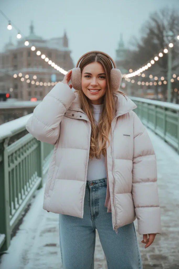 ❄️ 11. White Puffer Coat + Light Wash Jeans + Fuzzy Earmuffs