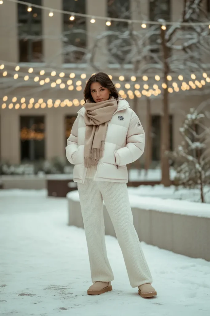 An all-white outfit creates a bright and soft winter look that feels calm and stylish. The white puffer adds warmth while the knit pants keep the outfit comfortable for long days outside. Sam pairs the set with cream Uggs for a cozy finish that works well on snowy paths. The beige scarf adds a gentle contrast without breaking the clean color palette.