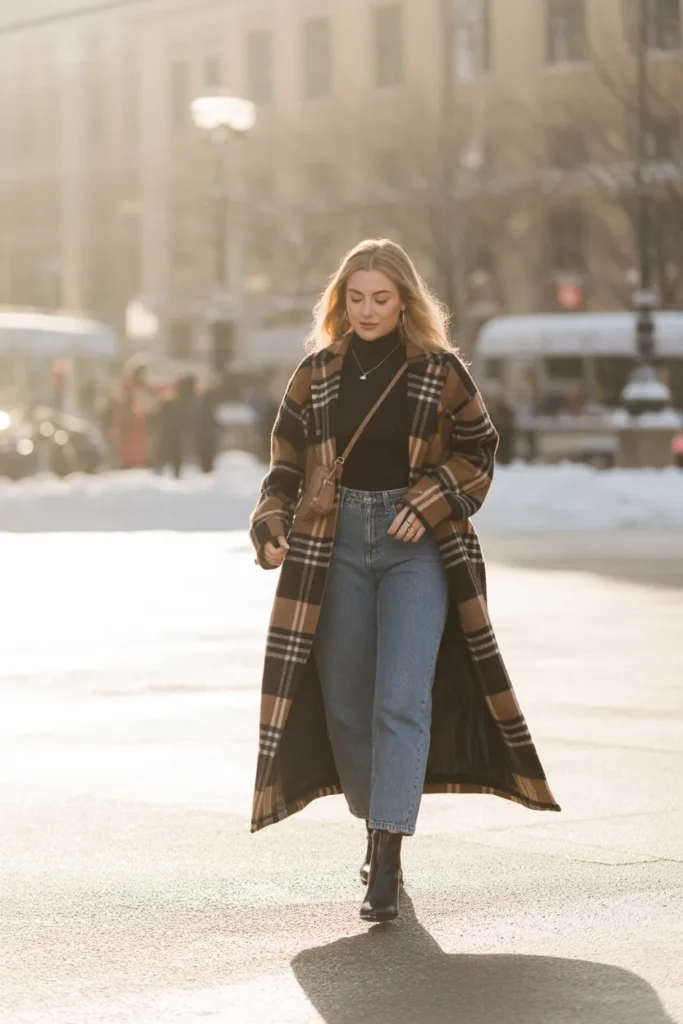 A long plaid coat adds instant style to a simple winter outfit. The bold pattern gives depth and interest, especially when layered over classic denim and a dark turtleneck. Sam chooses high-waisted jeans because they pair well with longer coats and create a flattering winter silhouette. The mix of textures keeps the look warm but still easy to move in.