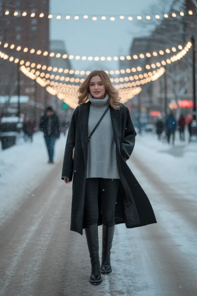 This winter look is perfect for cold mornings, shopping trips, or evening walks through decorated streets. The charcoal coat stands out against snowy backgrounds while the gray turtleneck layers smoothly underneath. The tall boots keep the outfit practical, especially when sidewalks get icy. It’s a style that stays warm, comfortable, and stylish all at once, making it a reliable choice for the entire cold season.