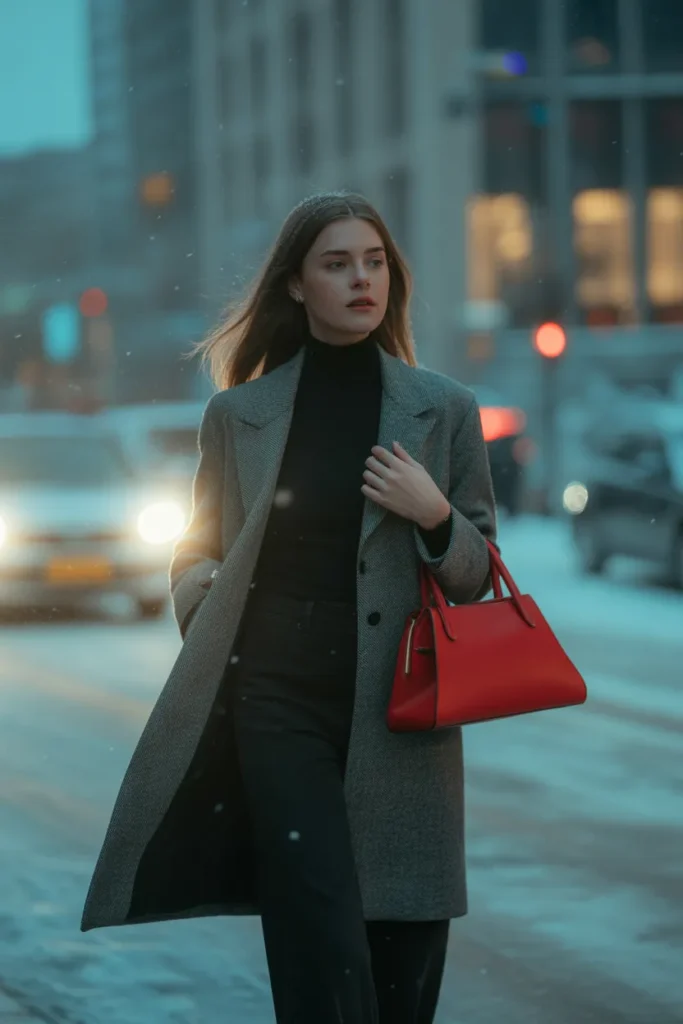 A gray wool coat brings a timeless winter look that always feels refined. When layered over a black turtleneck, the outfit becomes clean and strong, perfect for city settings. Sam adds a bold red handbag to introduce a striking pop of color. The contrast against the gray and black tones makes the entire outfit stand out in a stylish, polished way.